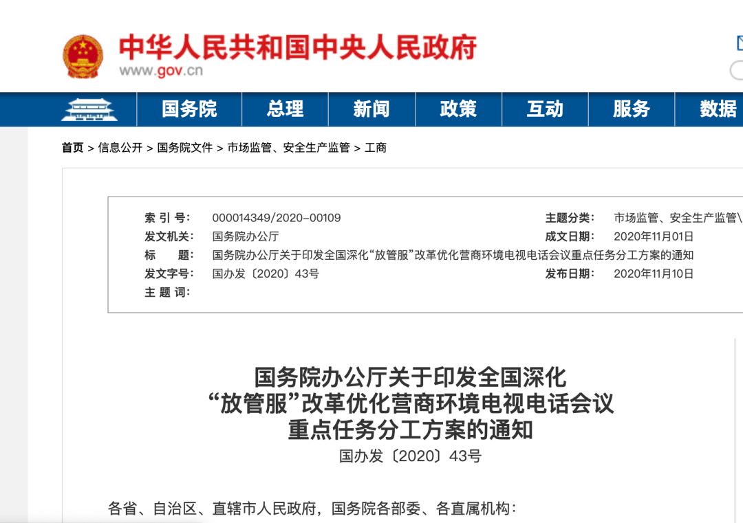 11月10日,国务院办公厅发布《国务院办公厅关于印发全国深化“放管服”改革优化营商环境电视电话会议重点任务分工方案的通知》(以下简称《通知》)。
