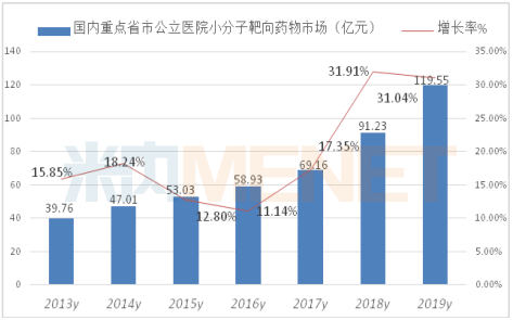 医院临床使用的小分子靶向药物已超过了50个化学名品种,销售额达到120亿元,同比增长31.04%,连续两年增长率超过了30%。