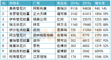 米内网数据显示,2019年国内重点省市公立样本医院伊马替尼市场为6.95亿元,在以量换价的形势下,同比下滑15.73%,仍是居于小分子靶向药物中销售额居第三位的品种。
