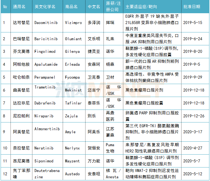2019年-2020年5月上旬NMPA批准上市小分子靶向新药
