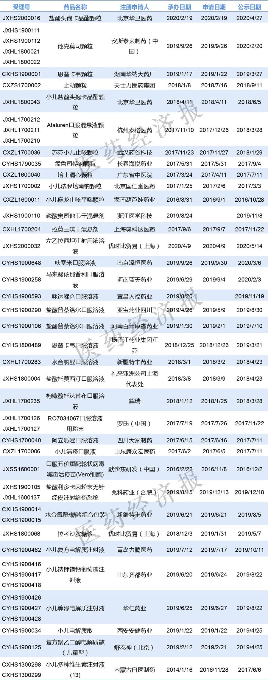 医药大学的藿苓生肌颗粒暂无优先审评理由,其余都是以“儿童用药”为理由纳入优先审评程序。
