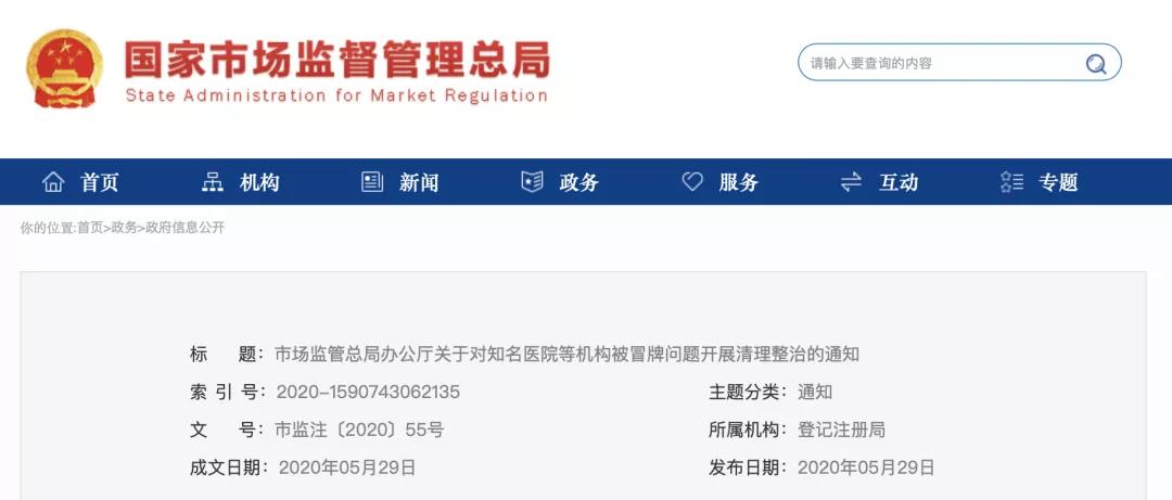 医院等机构被冒牌问题开展清理整治的通知》,严查医院乱象,该通知下发给全国各省、自治区、直辖市及新疆生产建设兵团市场监管局(厅、委),涉及所有医疗机构。
