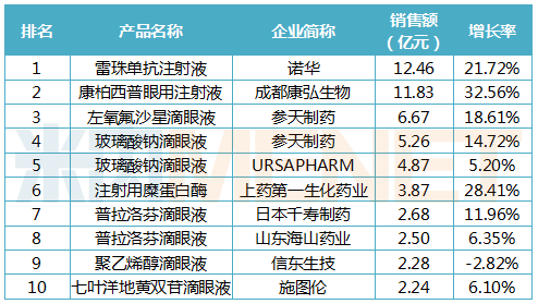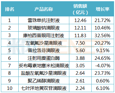 眼科用药产品TOP10中,10个产品销售额均过亿,3个为独家产品。雷珠单抗注射液、玻璃酸钠滴眼液、康柏西普眼用注射液销售额均超过10亿元。妥布霉素地塞米松滴眼液销售额增长率继续下滑,康弘药业的1类新药康柏西普眼用注射液销售额以32.56%的增长率领跑。
