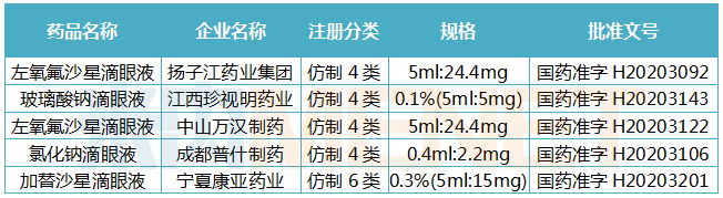 2020年至今,国内市场共有5款眼科用药产品获批上市。扬子江药业集团、中山万汉制药的左氧氟沙星滴眼液、康恩贝子公司珍视明药业的玻璃酸钠滴眼液、成都普什制药氯化钠滴眼液均按新注册分类获批生产,视同通过一致性评价。