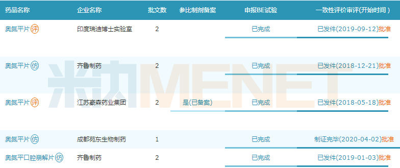 企业有豪森药业、苑东生物、印度瑞迪博士、齐鲁制药;奥氮平口崩片过评企业有齐鲁制药、东阳光药。