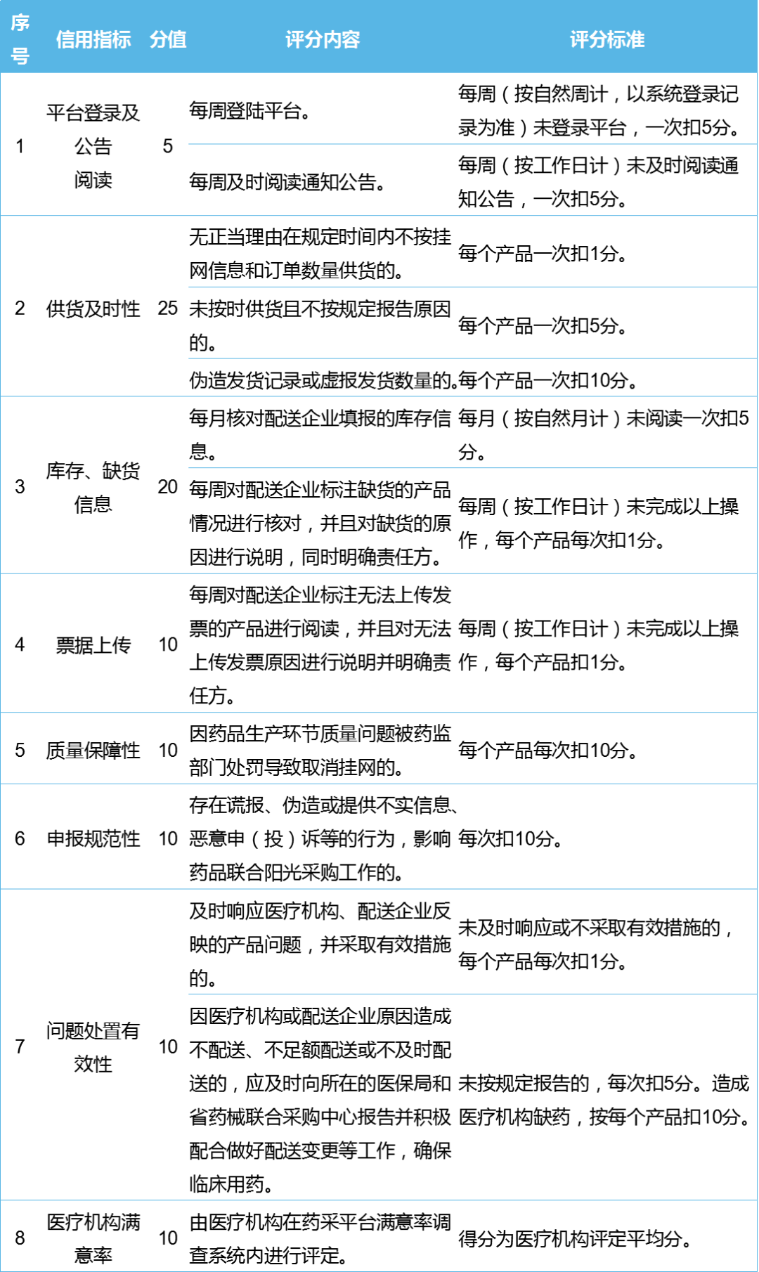 针对药品生产企业,福建亦设置了供货及时性、票据上传、质量保障性等8项信用指标。药企的药品保供能力毋庸置疑是福建此次评价的焦点,“供货及时性”指标以25分的分值排在首位,评分内容则包括了“无正当理由在规定时间内不按挂网信息和订单数量供货的、未按时供货且不按规定报告原因、伪造发货记录或虚报发货数量的”等药企断供现象。