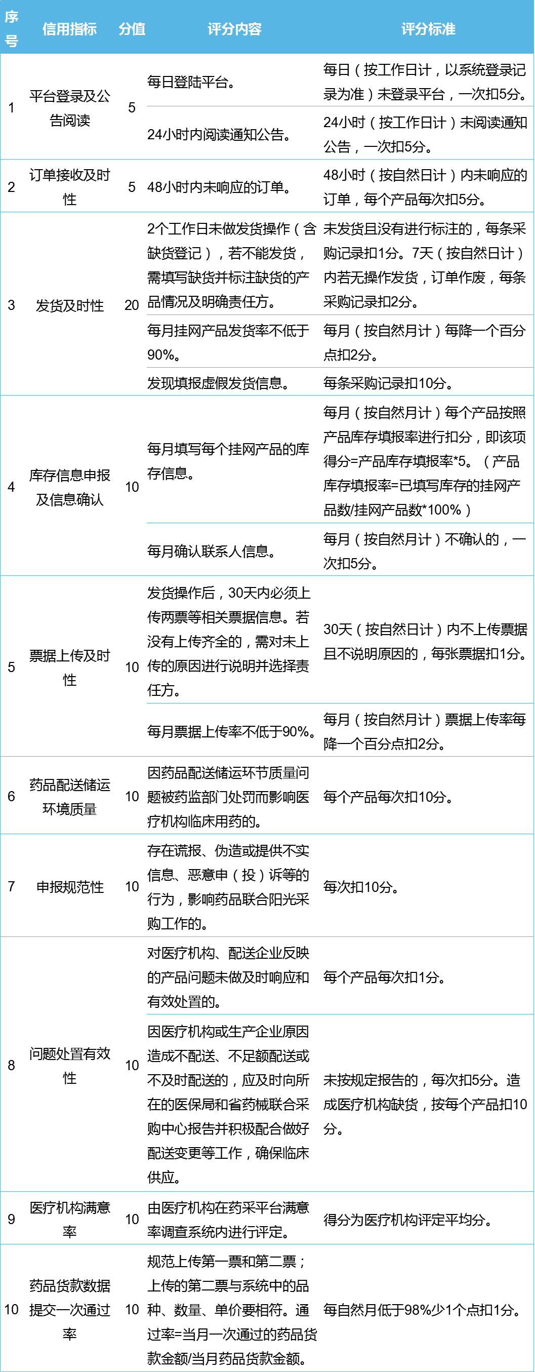 药品流通环节离不开药品配送企业的参与,流通企业同样也在福建的分级管理之列。针对药品流通企业,福建设定了订单接收及时性、票据上传及时性和药品货款数据提交一次通过率等10项信用指标。福建此次关注的重点在于企业发货和上传票据的及时性,分别给出了“每月挂网产品发货率不低于90%、每月票据上传率不低于90%”的硬性要求。