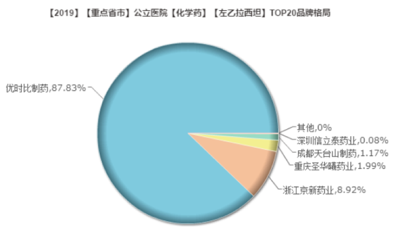 医院、县级公立医院、城市社区中心及乡镇卫生院(简称中国公立医疗机构)终端左乙拉西坦销售额为10.39亿元,其中片剂占比近90%。随着近年国内仿制药的发力,原研药企优时比制药的市场份额已从最初的独占市场,下滑到2019年的87.83%,紧随其后的是京新药业(8.92%)、重庆圣华曦(1.99%)、天台山制药(1.17%)、深圳信立泰(0.08%)。
