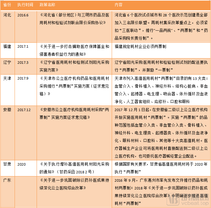 截止2019年10月,总共有25个省市实施了耗材“两票制”。其中,内蒙古、辽宁、陕西、安徽、湖北、江西、贵州、广东、福建、海南、青海、西藏12 个省份已全面执行耗材两票制;黑龙江、河北、山西、河南、江苏等 6 个省份在部分试点城市执行耗材两票制;湖南、广西、浙江、四川、甘肃、宁夏、山东等 7 个省份发布了相关文件;仅北京、上海、重庆、山东、吉林、新疆6个省市没有执行两票制。