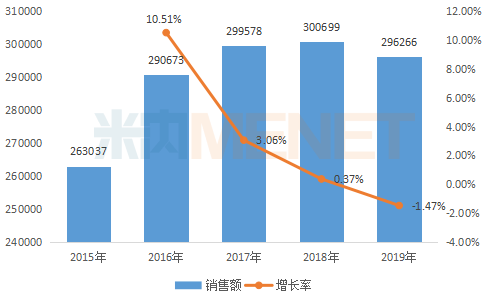 图1:2015-2019年中国公立医疗机构终端注射用美洛西林钠舒巴坦钠(4:1)销售情况(单位:万元)
