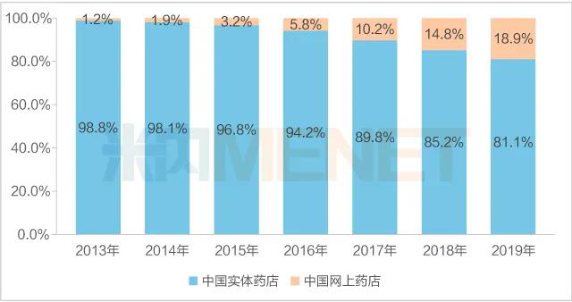 2013-2019年中国实体药店和网上药店(含药品和非药品)销售额占比
