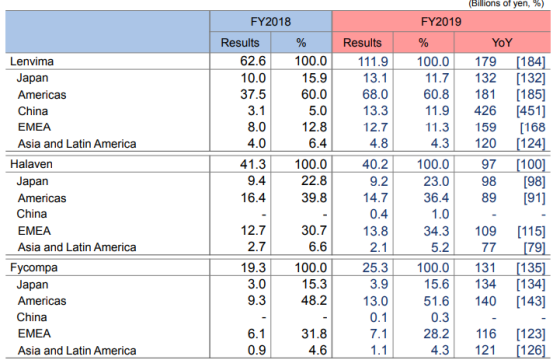 除了乐卫玛外,Fycompa(吡仑帕奈)的销售额也从12.37亿元增长31%至16.22亿元。而与其相反,Halaven(海乐卫)的销售额略有下降,从27.47亿元降到了25.77亿元,这主要是日本、亚洲及拉美地区的销售额略有下降所致。