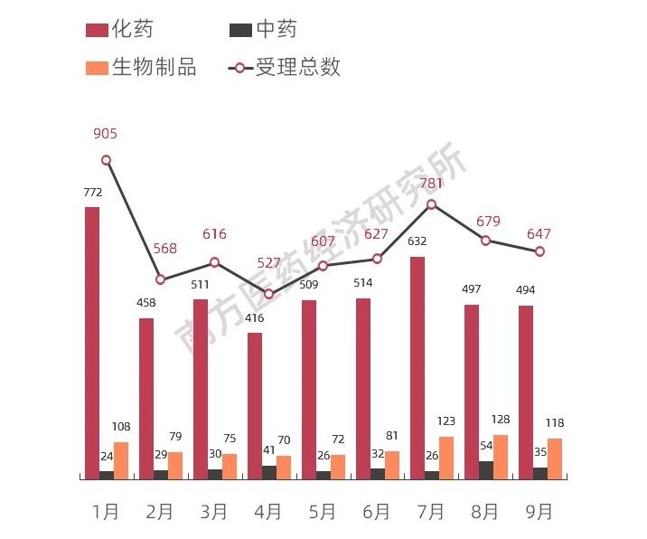图表9 2019年前三季度CDE受理药品注册情况