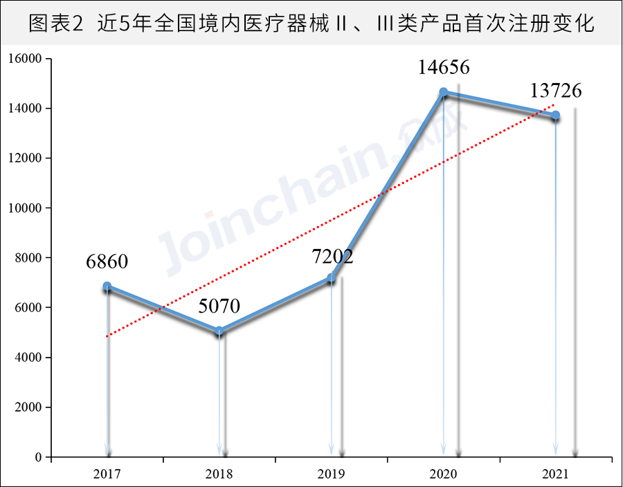 2017-2021年,全国境内医疗器械Ⅱ、Ⅲ类产品首次注册(以下简称“首次注册”)数量总体呈上升趋势,近五年平均每年增长2332件。2018年是注册量最少时期,为5070件,之后在2020年达到最高,数量为14656件。除延续注册、信息变更外,2021年Ⅱ、Ⅲ类产品首次注册量为13726件,同比下降14.3%。