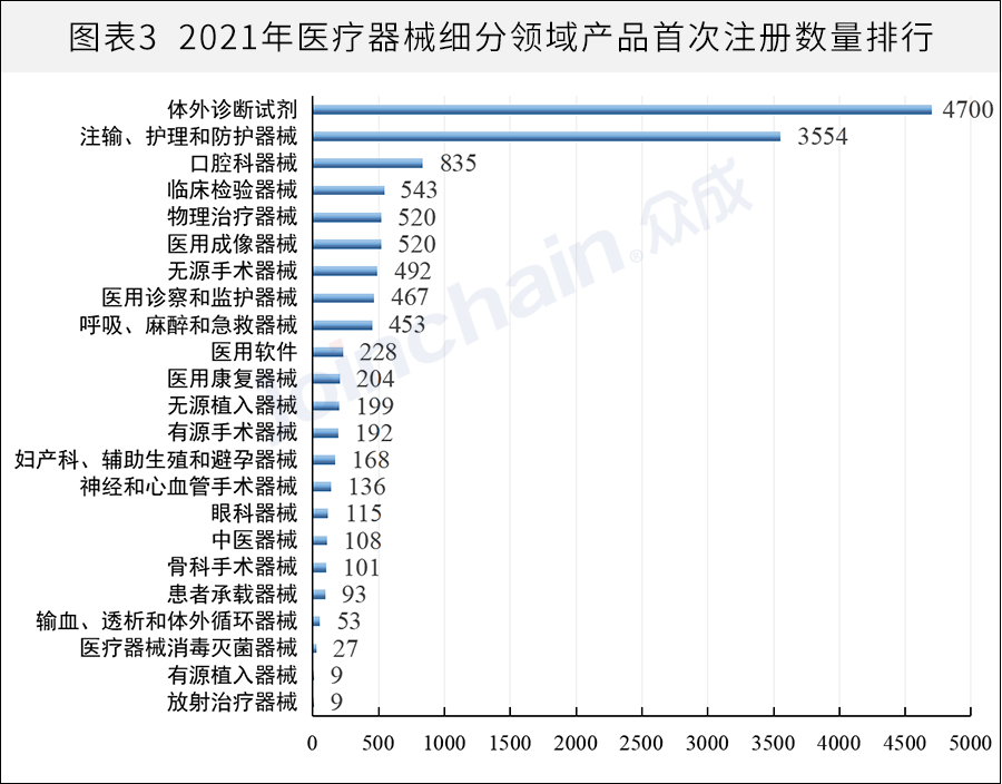 从细分领域来看,2021年Ⅱ、Ⅲ类首次注册数量排名第一的是体外诊断试剂,共计4700件,其次是注输、护理和防护器械的3554件。首次注册量最少的是有源植入器械和放射治疗器械,同为9件。
