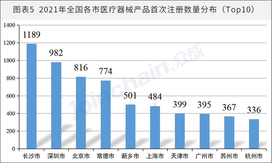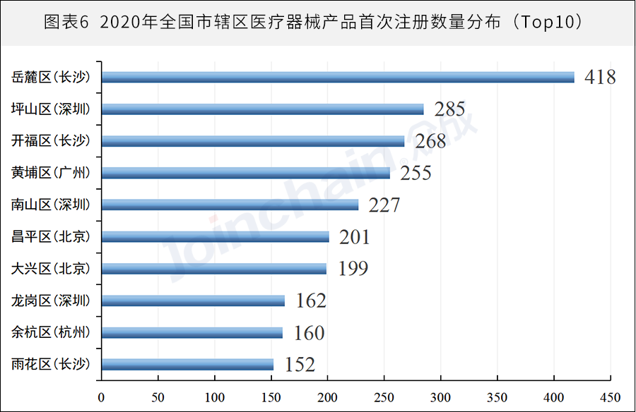 市辖区方面,医疗器械Ⅱ、Ⅲ类产品前十首次注册量平均233件。长沙岳麓区位居首位,共计418件;深圳坪山区和长沙开福区分别以285件与262件排名第二与第三。