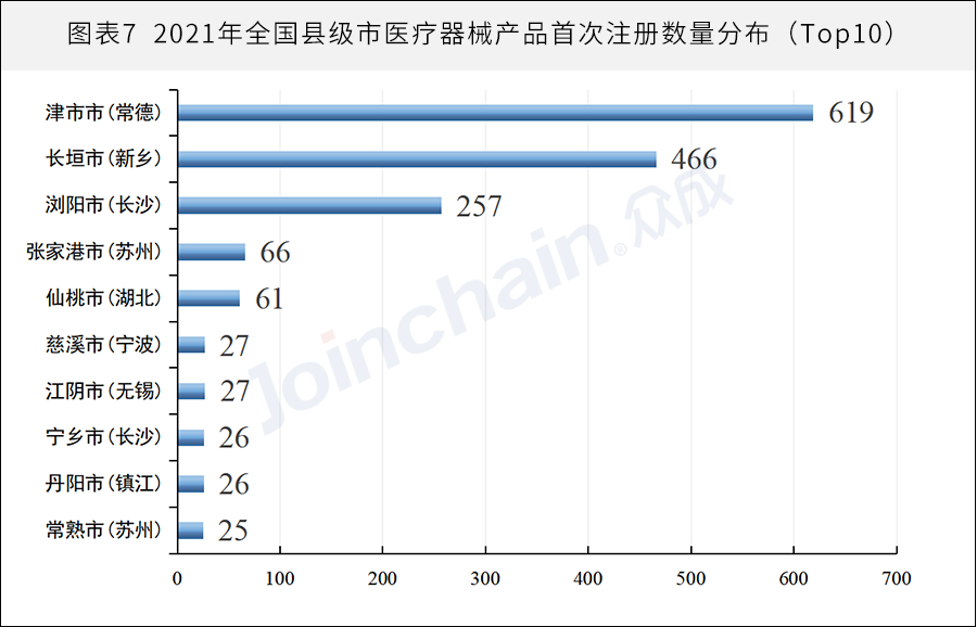 前十县级市排名方面,平均注册量为160件,其中,常德津市市医疗器械Ⅱ、Ⅲ类产品首次注册619件,位居全国第一;新乡长垣市、长沙浏阳市分别以466件与257件排名第二与第三,而其他前十县级市与前三位的差距较为显著。