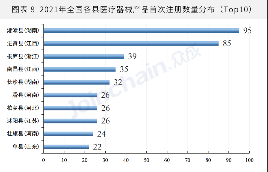 全国前十县的医疗器械Ⅱ、Ⅲ类产品平均首次注册为41件。湖南湘潭县,江西进贤县和浙江桐庐县为前三,数量为95件、85件和39件。