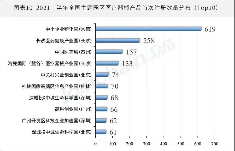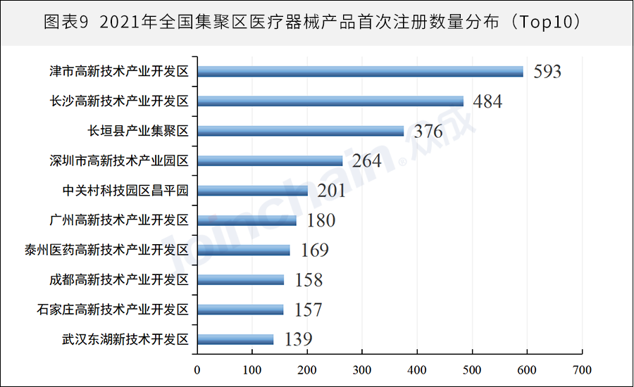 通过众成数科统计,2021年产业集聚区Ⅱ、Ⅲ类产品首次注册共计8515件,平均注册量为13件。津市高新技术产业开发区首次注册593件在首位;长沙高新技术产业开发区和长垣县产业集聚区以484件与376件紧随其后。