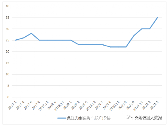 2017年,产地经营桑白皮以野生品种为主,家种品种也有销售,但货量不大,未刮皮统货报价在15.5元上下。