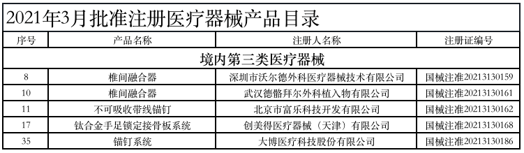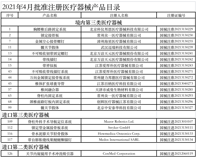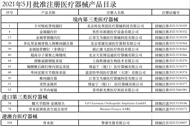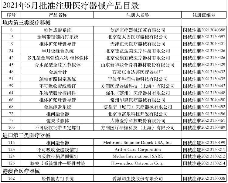 附:2021年1-6月获批的骨科医疗器械产品